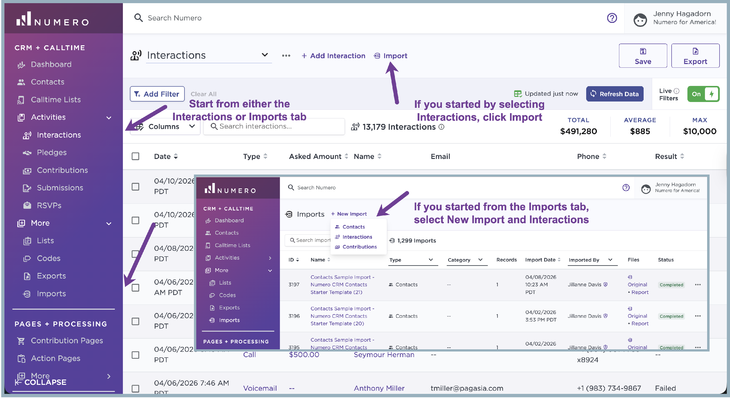 To bulk import, a list of interactions, whether, from an existing spreadsheet you have or by using our interactions import template, follow the below steps. Interactions are going to be dated interactions from when you previously spoke with a contact, for example. You can also import pledges in bulk (see below). Keep in mind when you utilize our calltime app, your interactions will automatically record into your contact profiles once logged in the app. Before you go through the import steps, it's really important your file is in tip-top Numero import shape:
