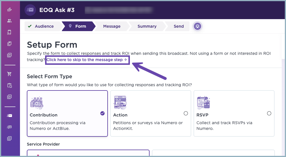 If you're choosing Numero, select the form you want to use from the dropdown. If you're using ActBlue, NGP, or another form link, you'll need to paste the form URL into that field rather than choosing from a dropdown. When you add this URL, it is required that you include https:// as part of the full link. If you choose any of the non-Numero options, we will still create SpeedyGive links if you use the SpeedyGive merge tag in the Message editor.