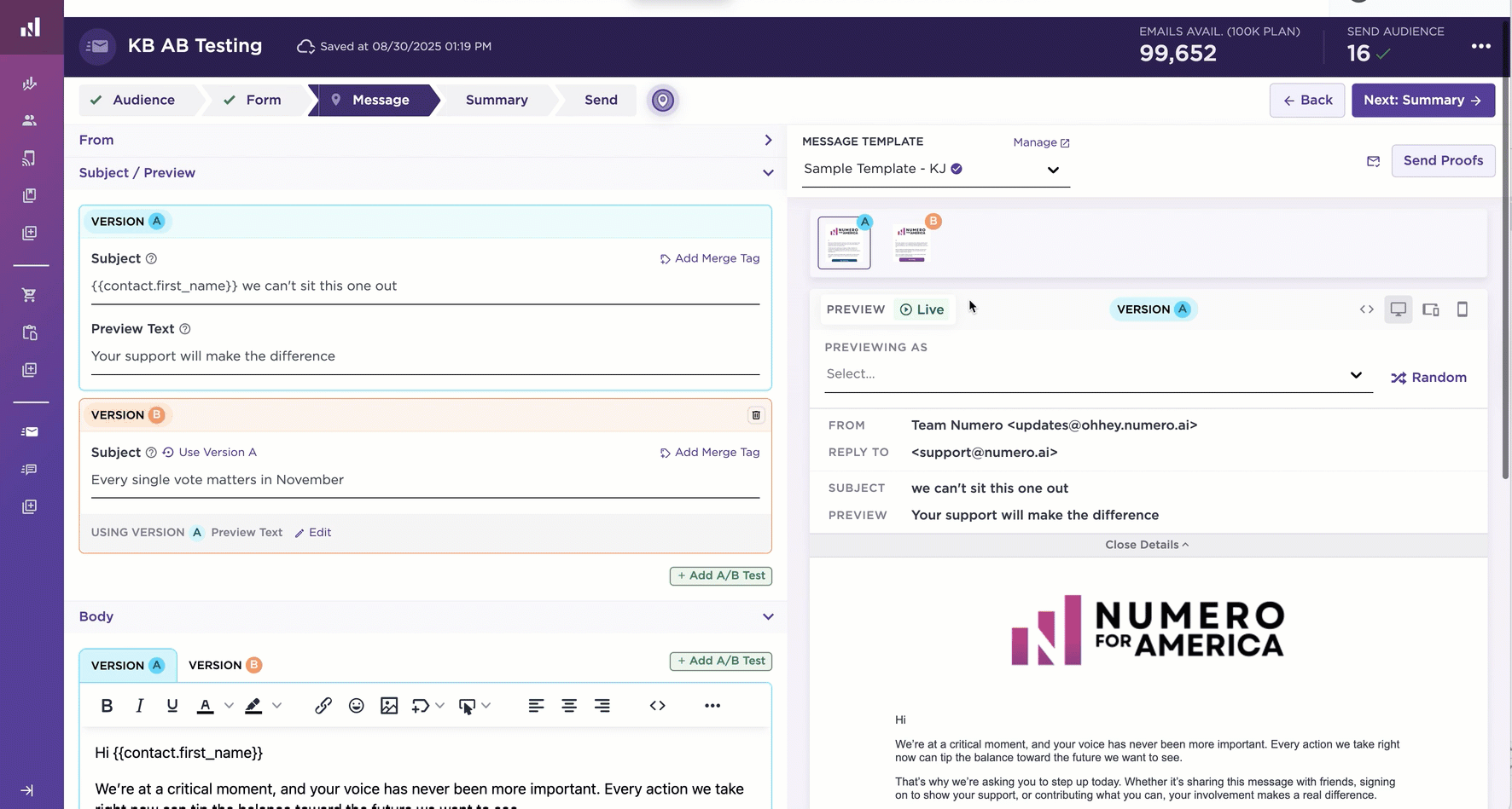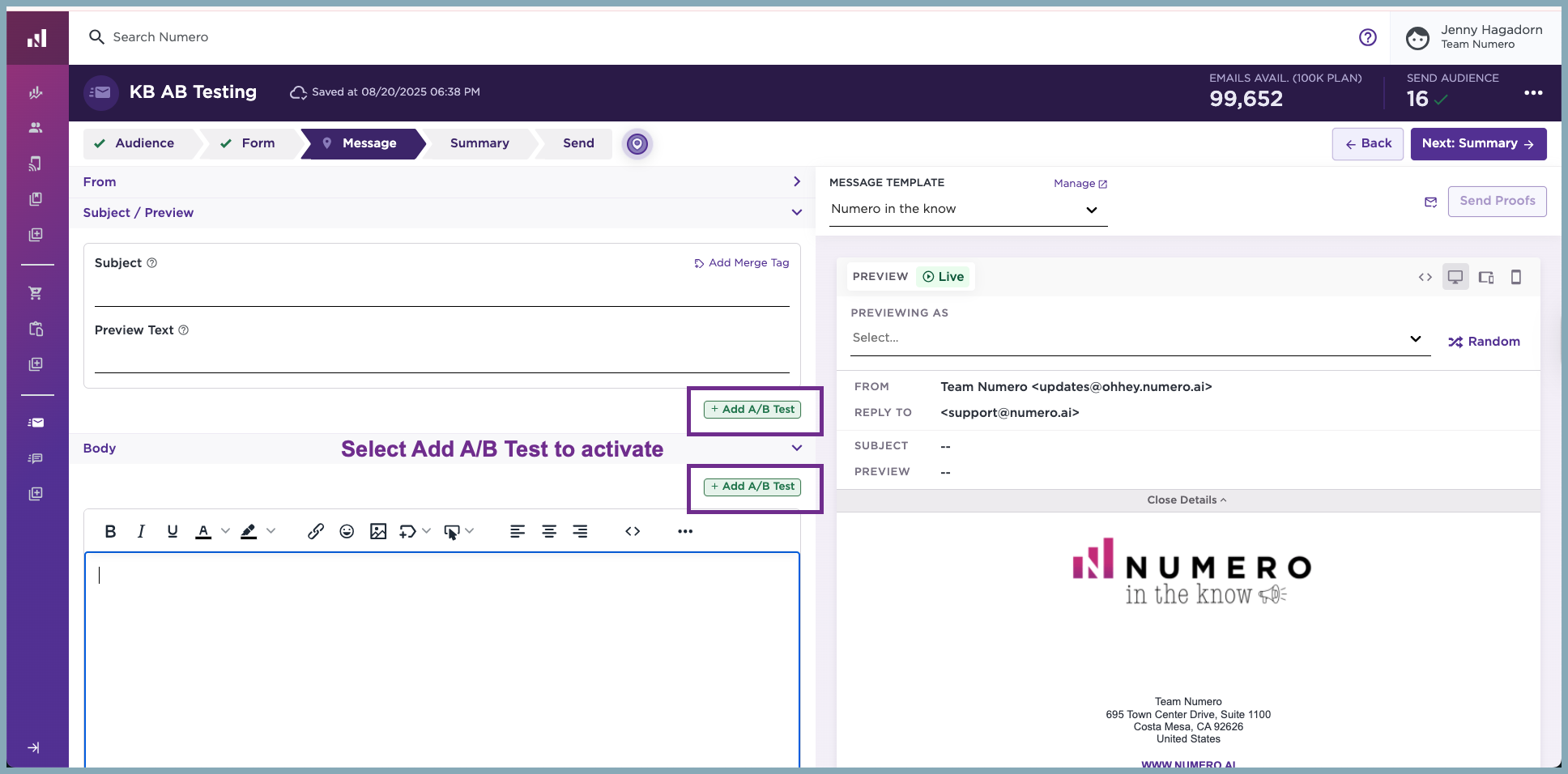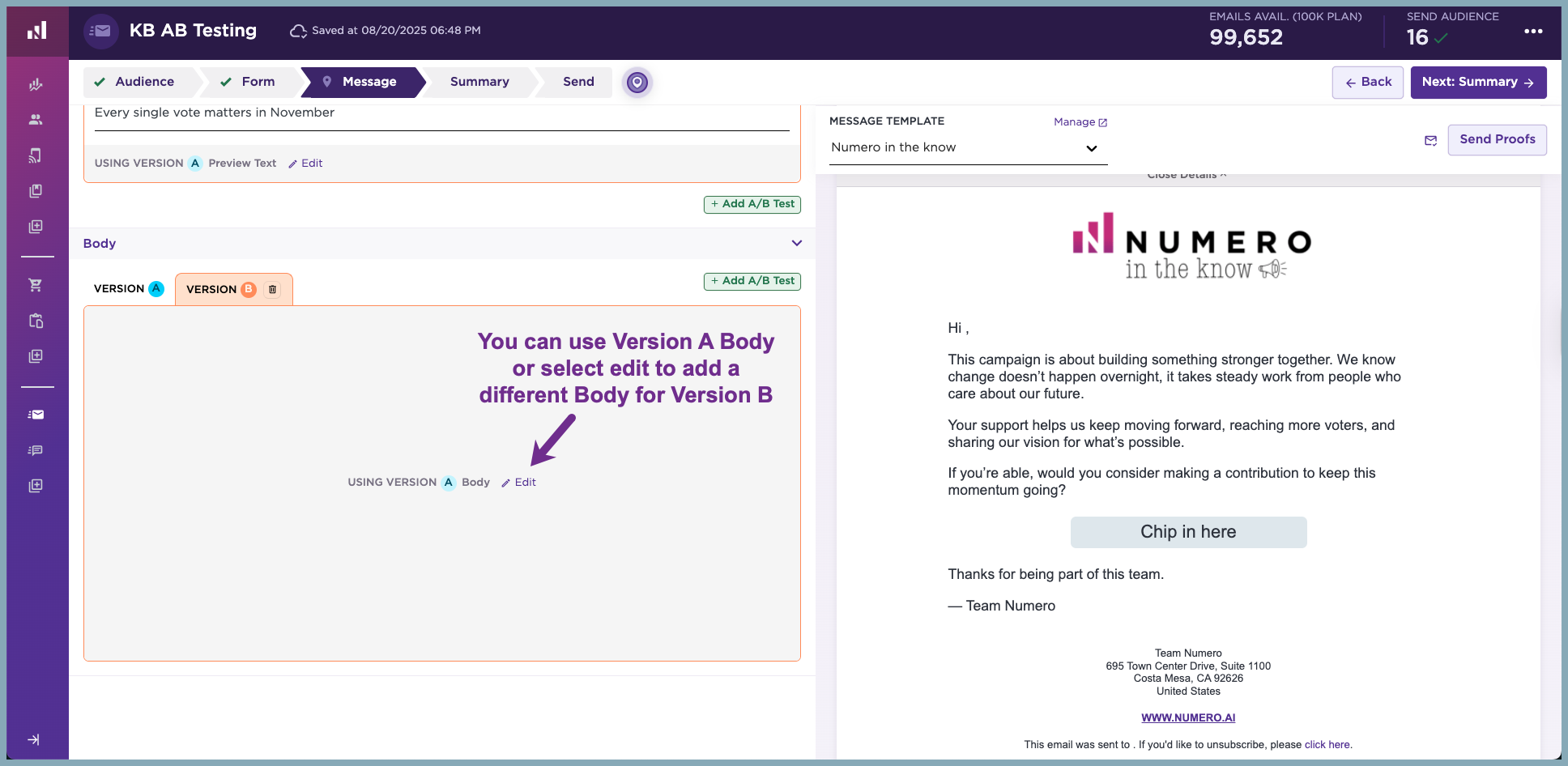 Step 3: In the Body, include what you want to say in Version A. You can use the same Body in Version B, or you can edit it to be different.