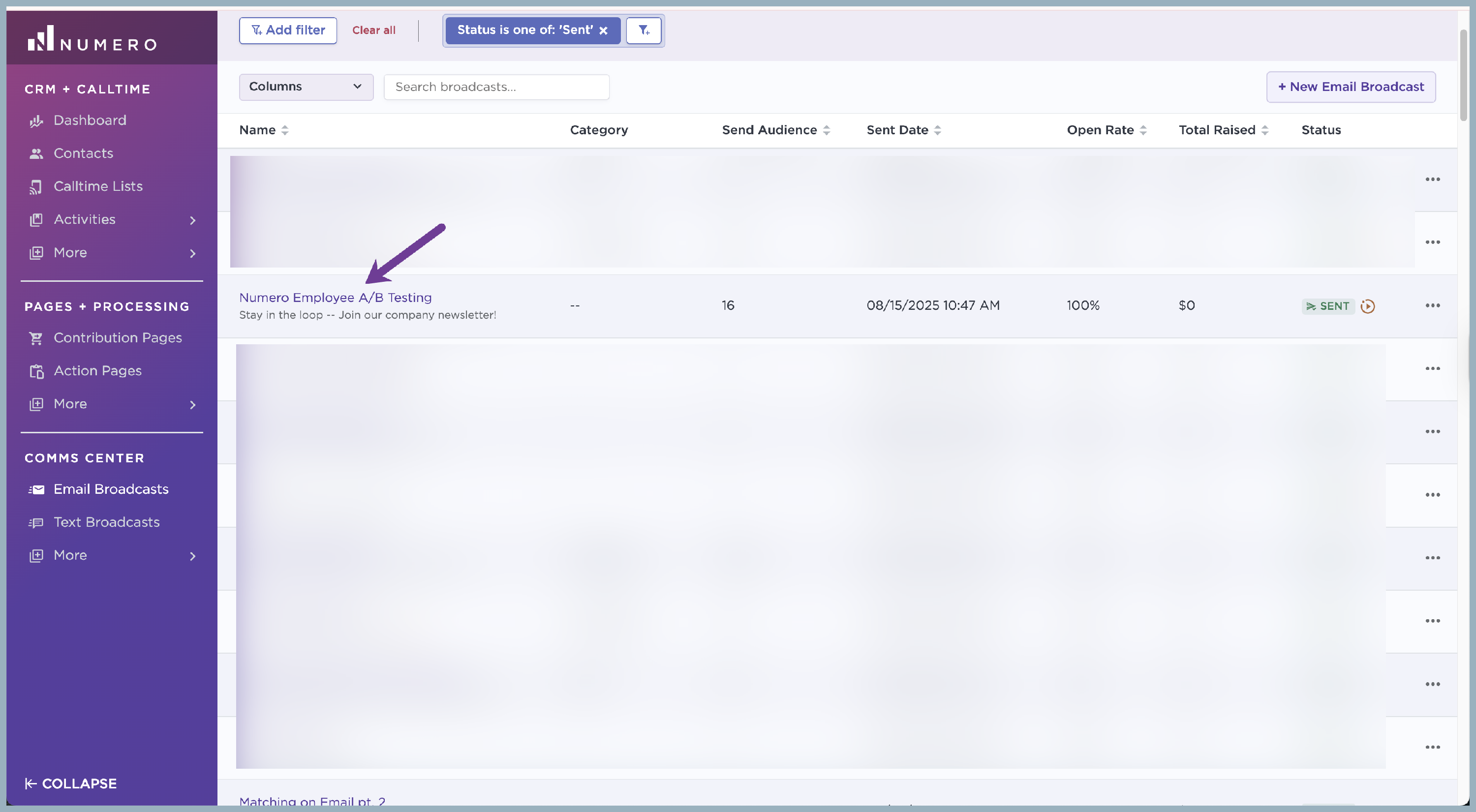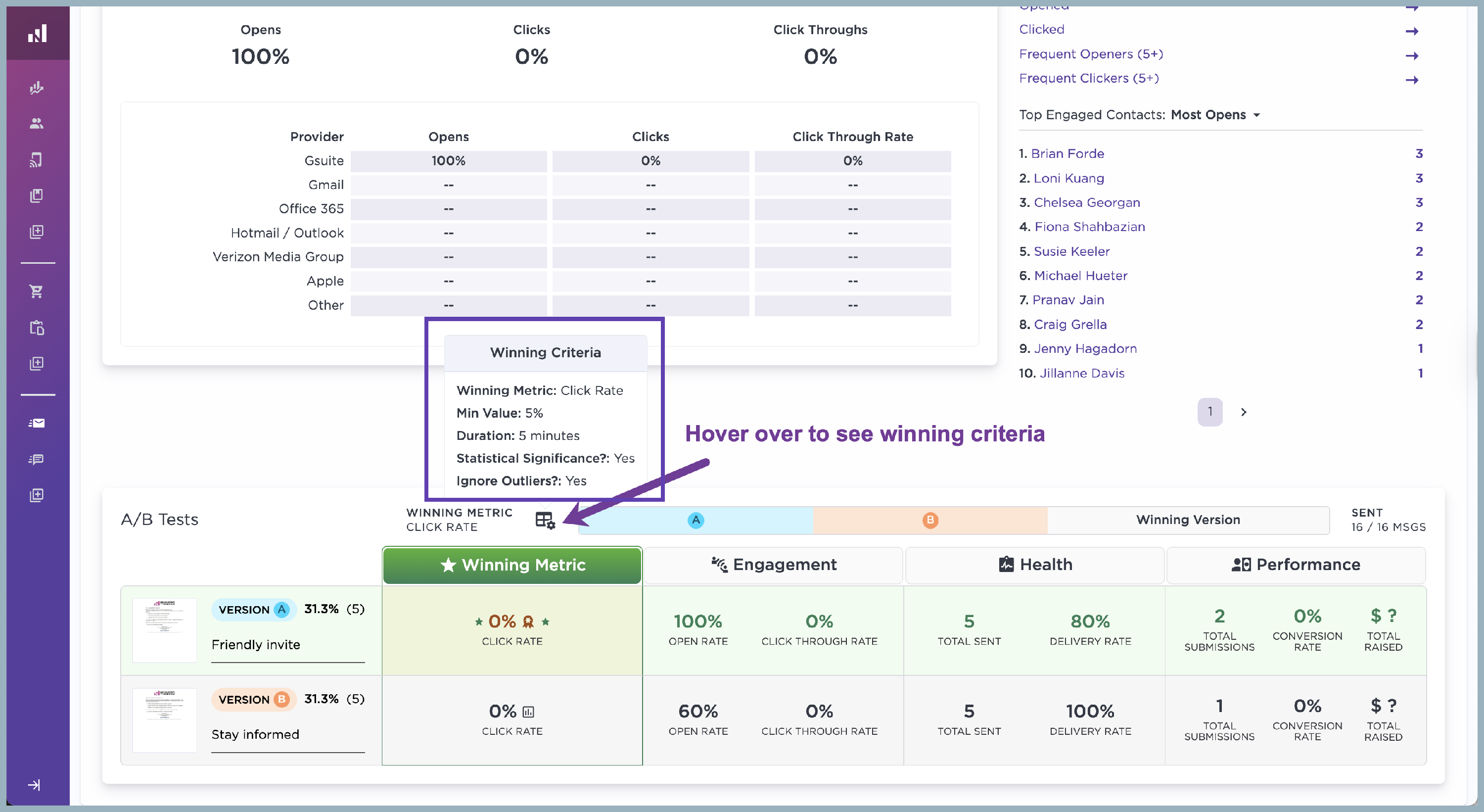Whether you chose your test to automatically send to the winning version or pause to give you a chance to continue sending to the winning version, you can check out performance in the overview once the wi. The usual metrics cards and graphs will be displayed, with the A/B Tests section now at the bottom.