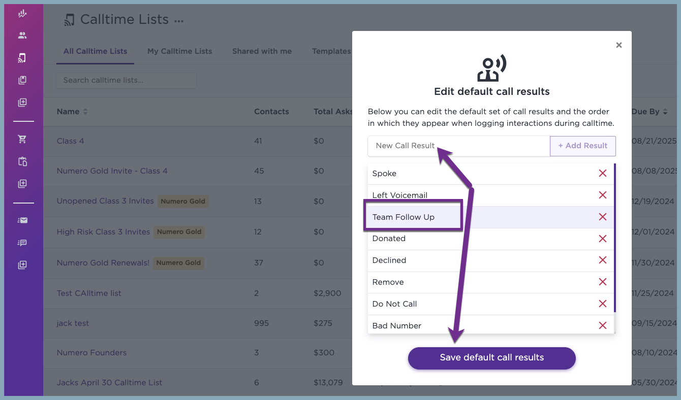 - Step 1: Log a custom result, such as "Calltime Follow Up" - instructions