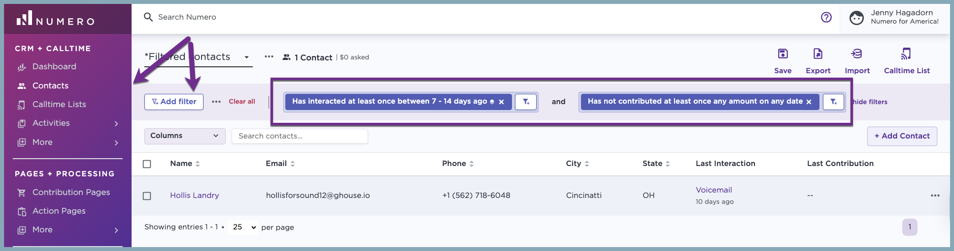 - Step 2: Create a Contact filter for "Interacted between 7-14 days ago with Result: Calltime Follow Up" and "Has Not Contributed" (i.e. contacts who you spoke to 1-2 weeks ago but haven't contributed to the committee yet)