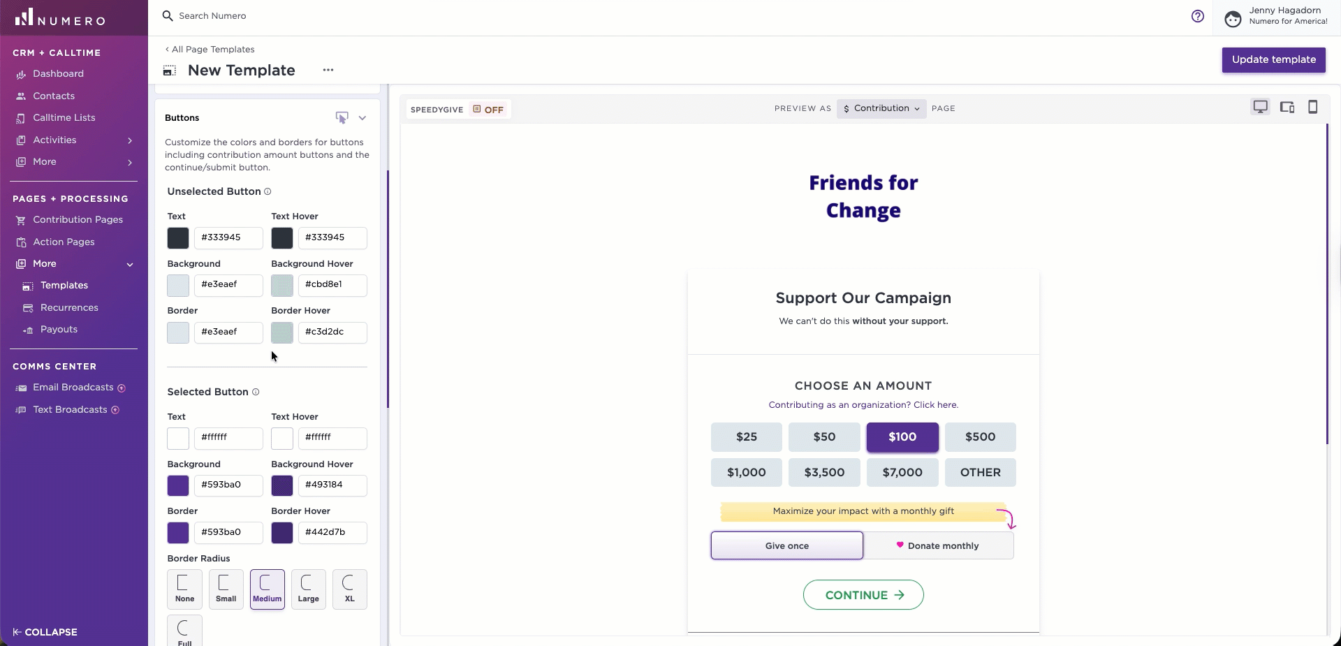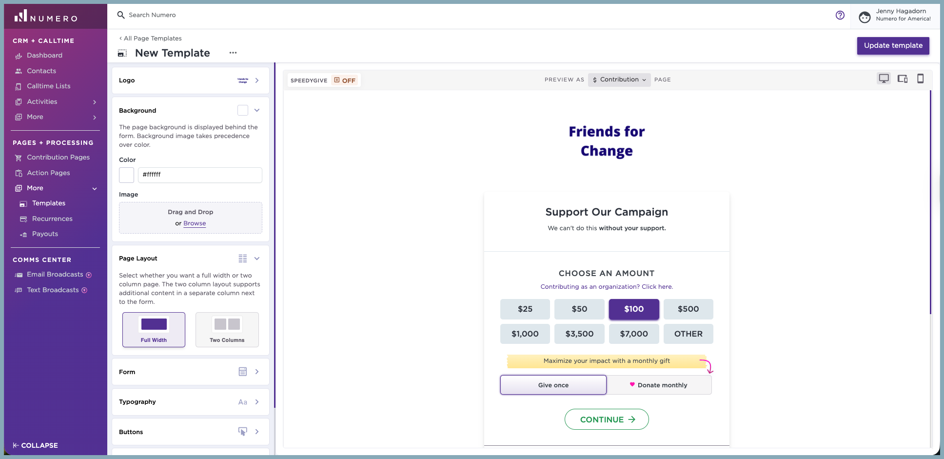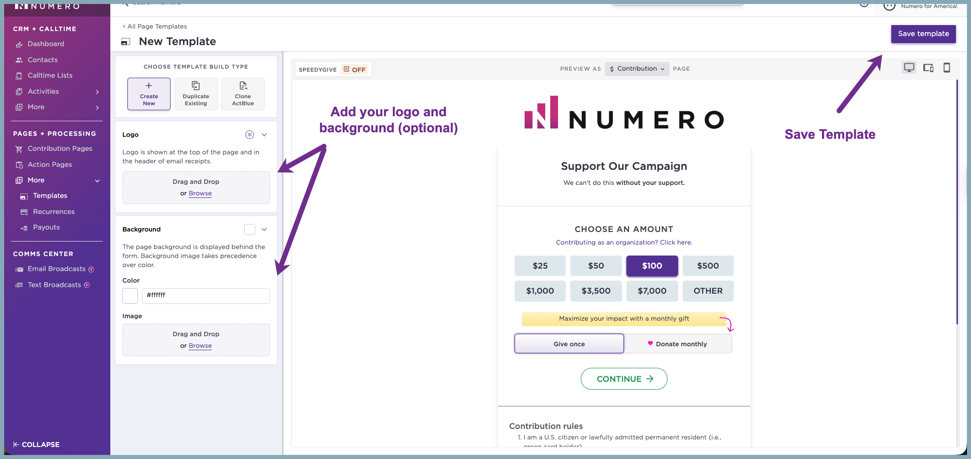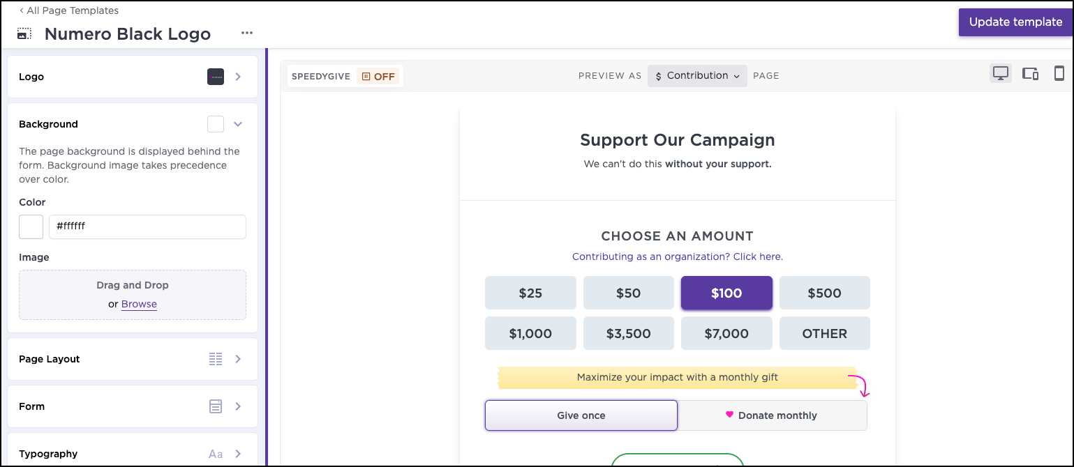 All Numero Contribution and RSVP pages require a template before you can go live and collect contributions and RSVPs. Templates contain all of the visual elements of your form like layout preference, logos, backgrounds, button colors, etc. You can use a singular template on multiple forms or you can create new templates for new forms if they'll need their own customized look.