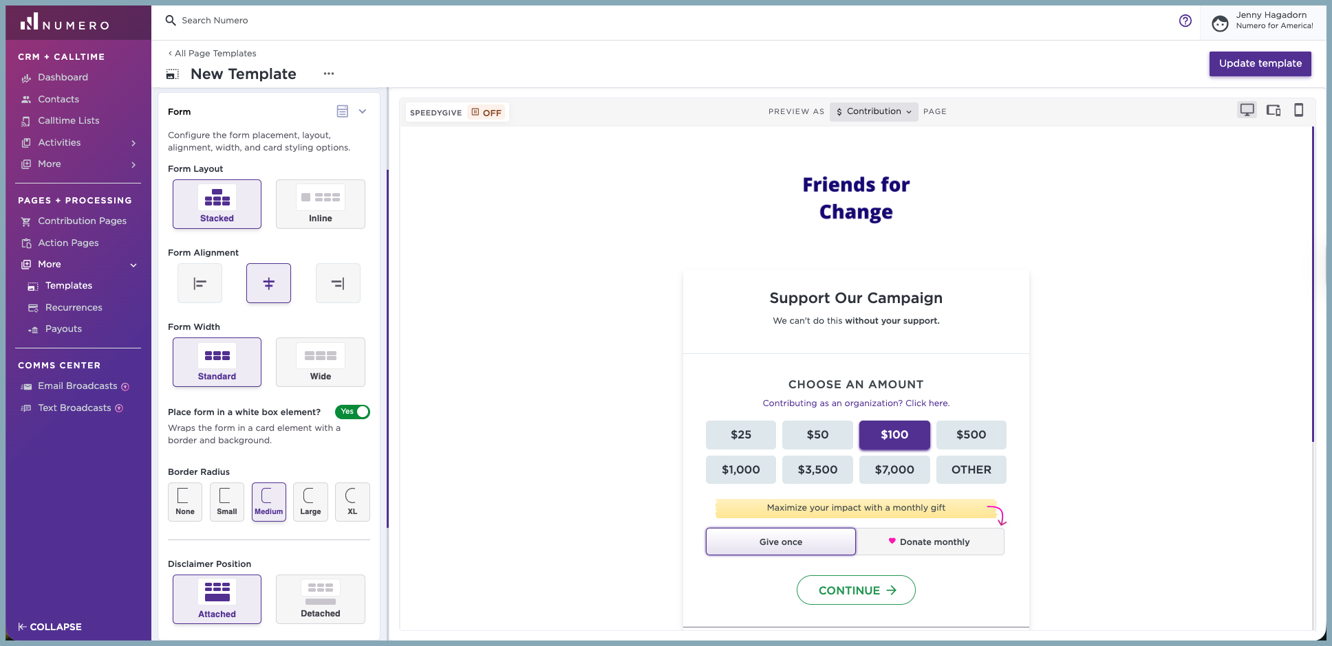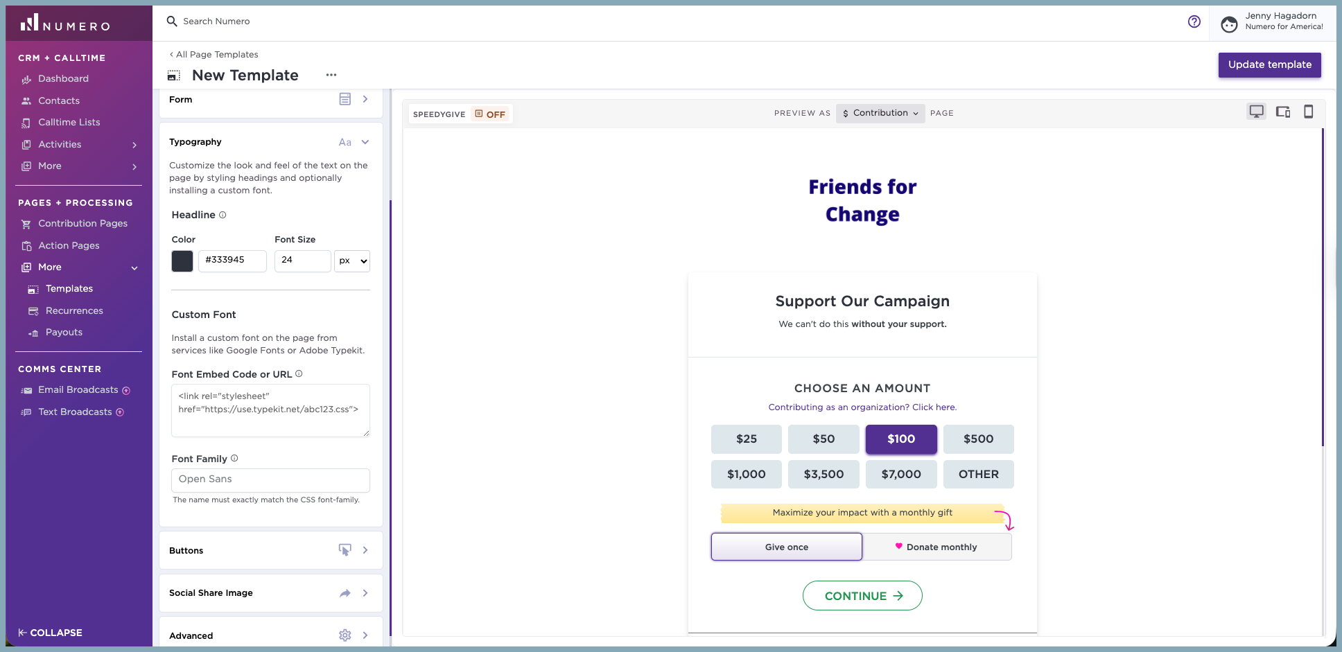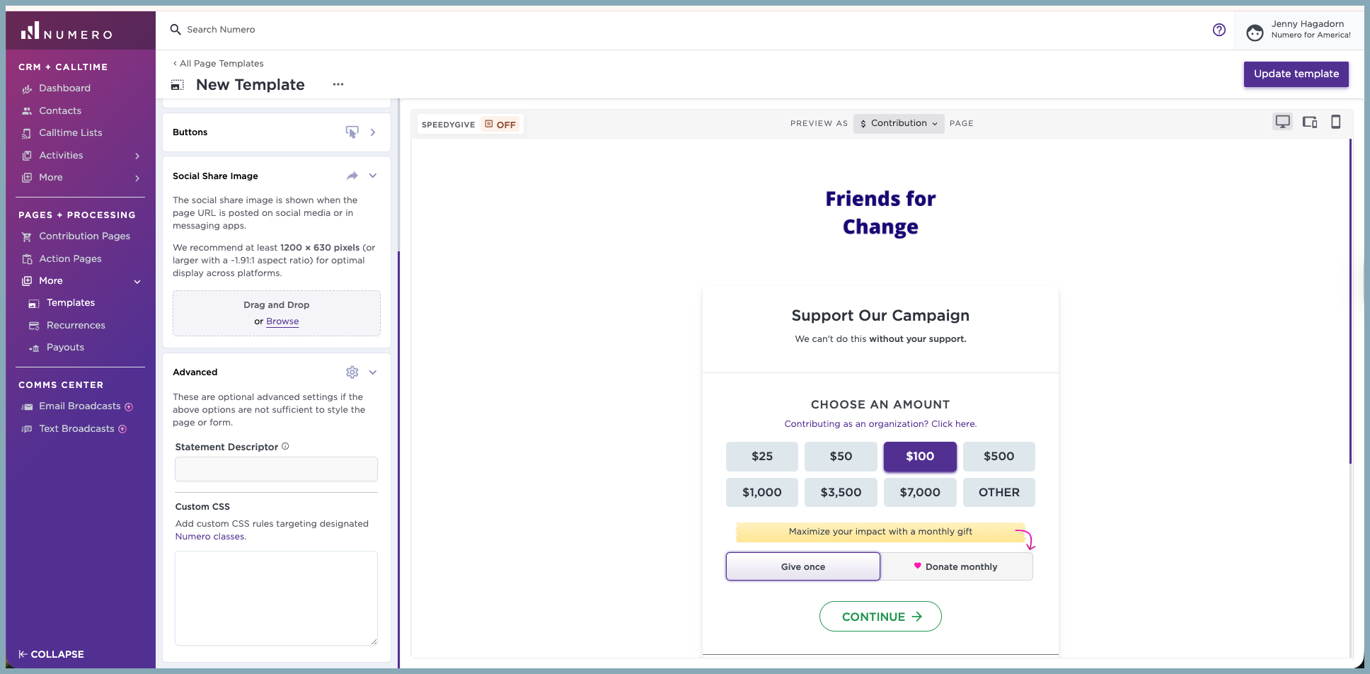 All Numero Contribution and RSVP pages require a template before you can go live and collect contributions and RSVPs. Templates contain all of the visual elements of your form like layout preference, logos, backgrounds, button colors, etc. You can use a singular template on multiple forms or you can create new templates for new forms if they'll need their own customized look.