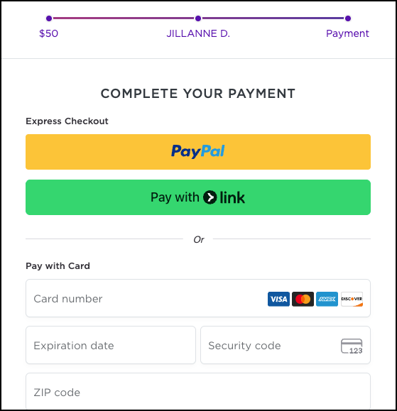 Once your platform has connected their PayPal account, your donors can checkout on your Numero Contribution forms using the PayPal option. All of your existing live contribution forms will contain a PayPal option in the Express Checkout options. This option will display after the donor enters their contribution amount and donor details (name, address, employer/occupation). The donor will need to have or create a PayPal account in order to checkout using this wallet method.