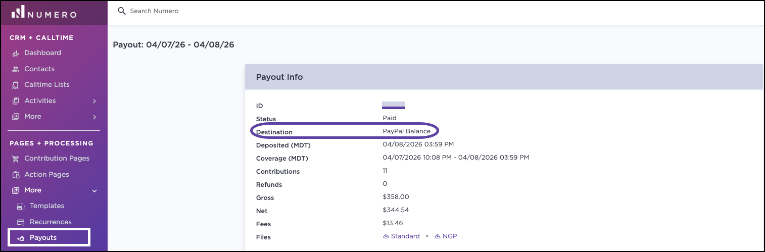 PayPal payout files will generate into their own file (separate from your Stripe account payouts) with the Destination noted as PayPal Balance. While the funds are deposited into your PayPal balance, you are responsible for managing your PayPal settings in your PayPal account regarding deposits to your actual bank account and determining how that impacts your reporting cutoffs with your compliance lead. You can download a PayPal balance payout report in standard or NGP friendly export files.